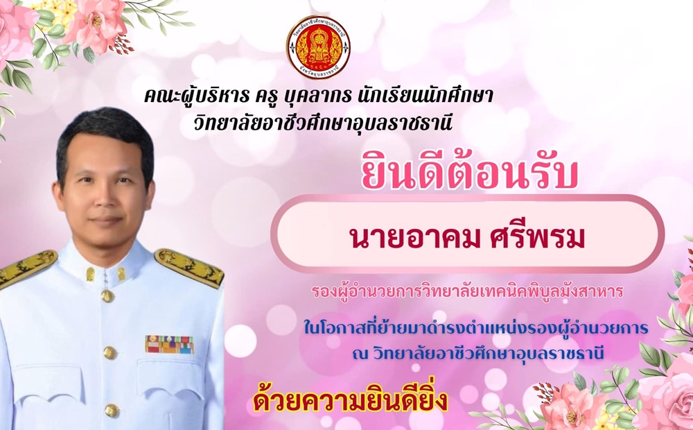 นายอาคม ศรีพรม รองผู้อำนวยการวิทยาลัยเทคนิคพิบูลมังสาหารในโอกาสที่ย้ายมาดำรงตำแหน่งรองผู้อำนวยการ ณ วิทยาลัยอาชีวศึกษาอุบลราชธานี